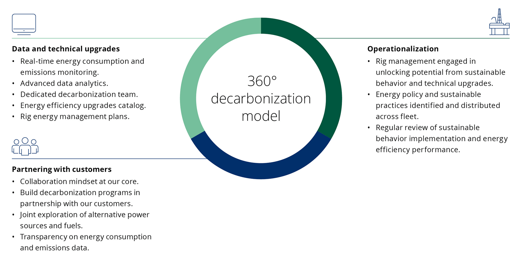 Integrating green methanol into offshore operations can reduce a company’s environmental footprint and contribute to broader energy transition and decarbonization programs. Noble continues to apply our 360-degree decarbonization model to implement data and technical upgrades, partner with customers and operationalize solutions to achieve a Sustainable Energy Future.